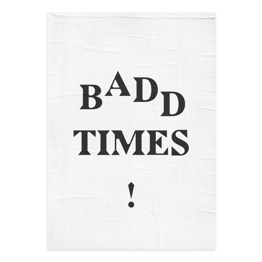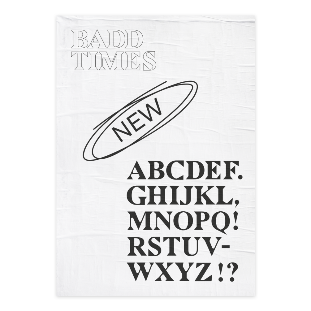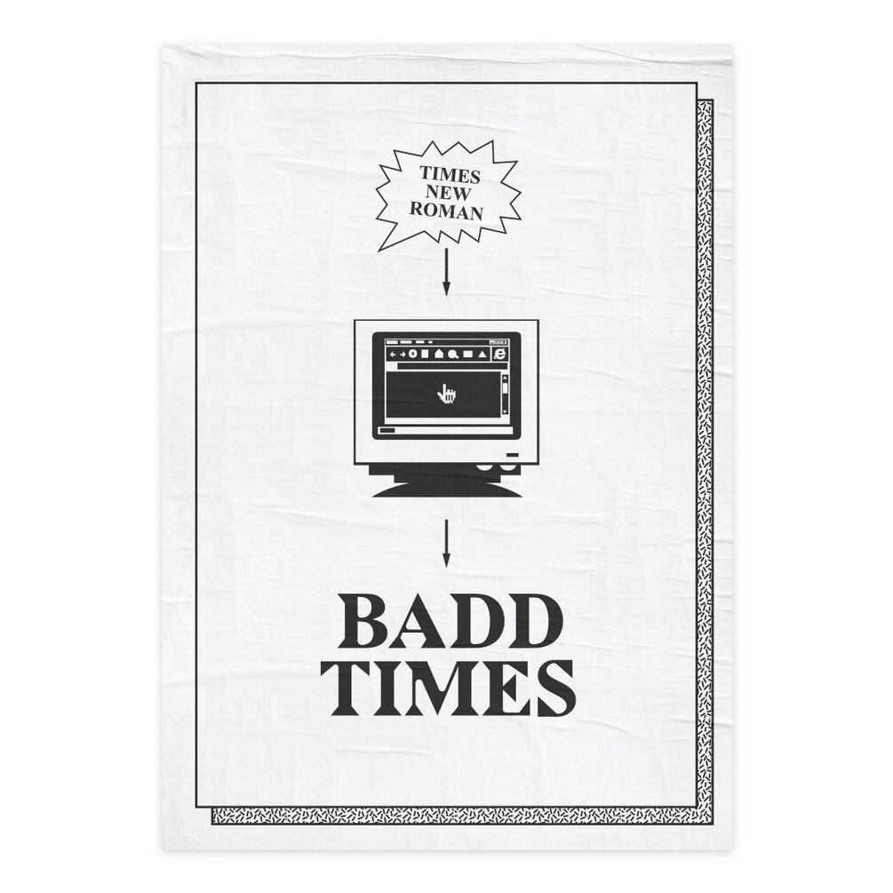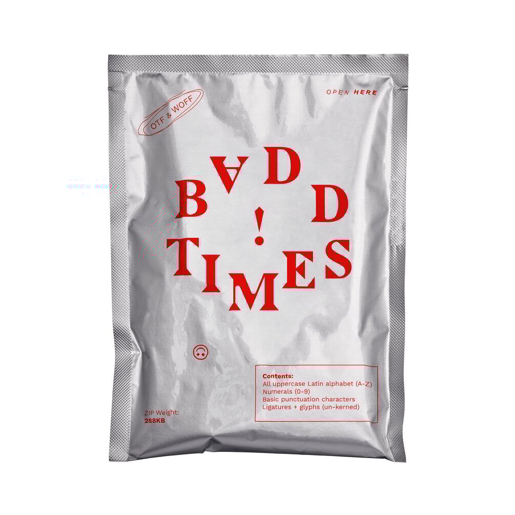Badd Times is a conceptual display face inspired by unconventional forms and freedoms of expression found in contemporary type design. Badly built from Stanley Morison's Times New Roman released in 1932 through Monotype. This is an experimental font and is available in upper case only, and with a limited character set.