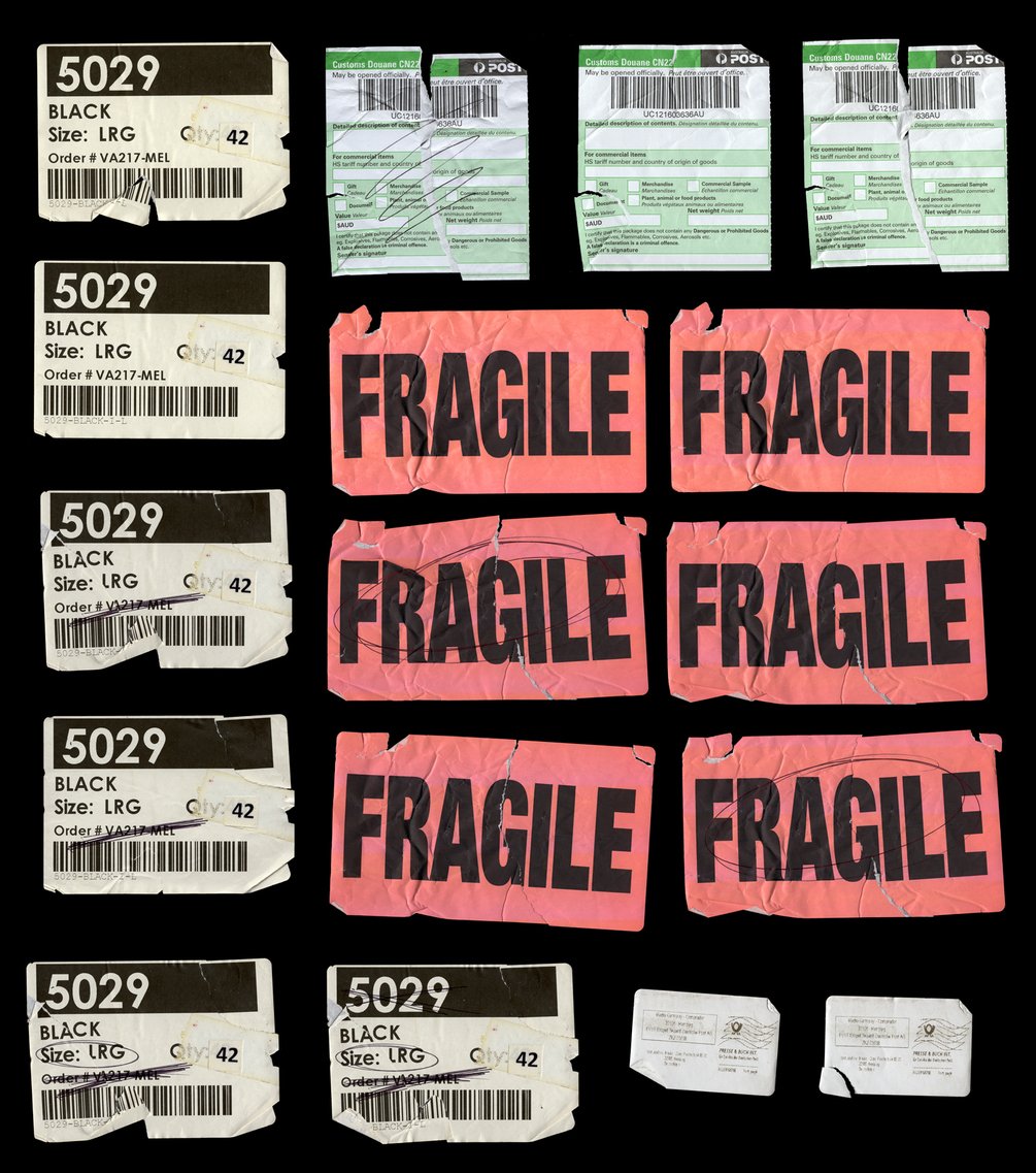 - Assorted ripped and crumpled postage stickers, barcodes, fragile labels